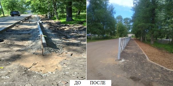 Благоустройство в мкр. Алексино с. Колчаново Волховского района Ленинградской области: обустройство тротуара у д. 12 (МОБУ Алексинская СОШ); устройство барьерных ограждений (ориентир д. 2, д. 3)